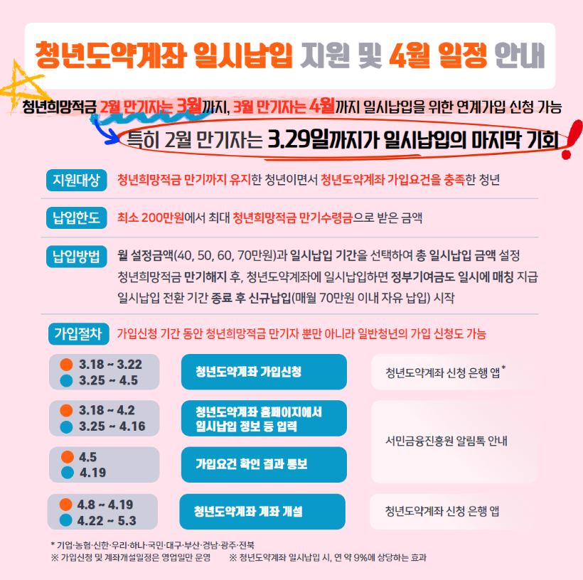 다들 사진을 참고하셔서 일정에 늦지 않게 계좌 개설 가입 신청을 하시길 바랍니다. 가입요건 확인 및 일시납입 입력, 수정기간 계좌 개설 일정 일정도 같이 나와있으니 참고하시기 바랍니다.